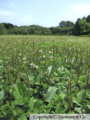 オオバコPlantago asiatica Linne´の全草は車前草として、種子は車前子として各々薬用とする。オオバコ単独でも鎮咳、去痰、利尿作用があり、お茶代わりに飲用されるが、排尿障害があったり、夜中にトイレに起きる回数が増えてきて寝付きが悪い、更年期の女性で残尿感が続くなど尿利障害を主に利尿、消炎、去痰、鎮咳の目的で清心蓮子飲、牛車腎気丸、竜胆瀉肝湯、五淋散などに配剤され、より効果を発揮する。日本でオオバコ科に属する植物はエゾオオバコ、ヘラオオバコ、ツボミオオバコなど、数種あるがオオバコ以外の使用はない。現在、主として中国から同じ基原種のものを輸入している。秋、果実が成熟した頃、地上部を刈り取り、陽乾し、手で揉んで風選し、種子を集める。生薬は黄褐色、黒褐色で良く充実し、においがなく、味はわずかに苦く粘液性、砂の混入の少ないものが良い。 |